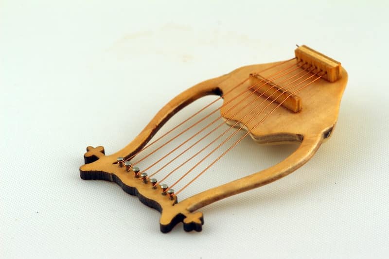 La lira era otro miembro de la familia de las cuerdas: similar a un arpa moderna en miniatura, se rasgueaba con una púa en lugar de tocarla con los dedos.